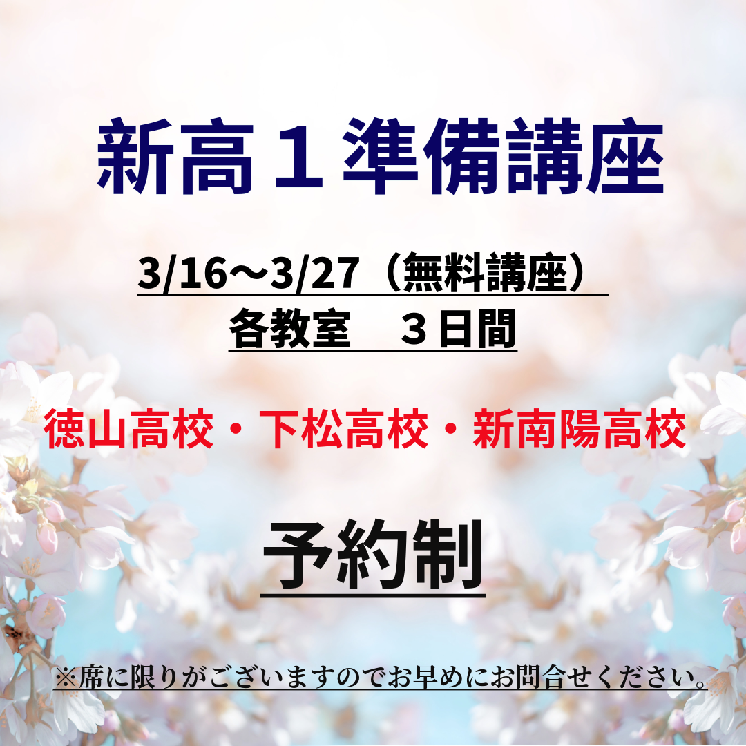 周南ゼミナールは高校生クラス(徳山高校・下松高校・新南陽高校)がございます。そこで3/16~27日のうち3日間を使って新高1準備講座(無料)を行います。高校での授業形態や大学入試のことを含む無料講座になっております。少人数制指導です。お席に限りがございますので、ご希望の方はお早目にお問い合わせください。